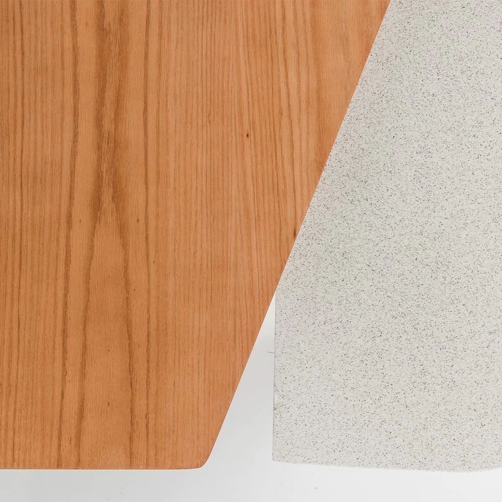 Conjunto de mesas de centro com design moderno, composto por modelo alto e baixo. Tampo triangular com traços curvos em lâmina de madeira e detalhe sobreposto em pietra. Mesa baixa com revestimento em pietra. Acabamento em verniz PU fosco e lâmina natural Cinamomo. ATENÇÃO: |